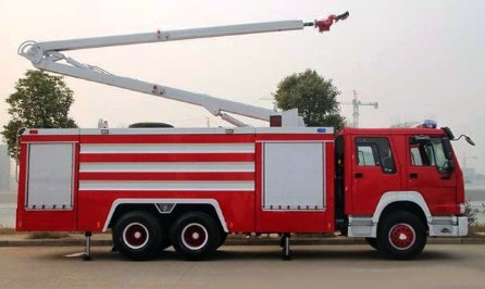23、舉高噴射消防車:該車屬于舉高類消防車,主要用于高層建筑火災撲救。由汽車底盤和兩節或多節臂組成,臂的頂端單獨或同時設有水炮(泡沫炮),在轉臺或地面上遙控操作,噴射炮可通過液壓馬達實現一定角度范圍的內俯仰,可調節噴射水成直流狀或開花噴霧狀,能有效的控制較大面積的火災;該車還配有一套高強度高揚度的水泵系統,能將泡沫混合液或水提升到高空后,在任意角度和方向都能進行噴射。